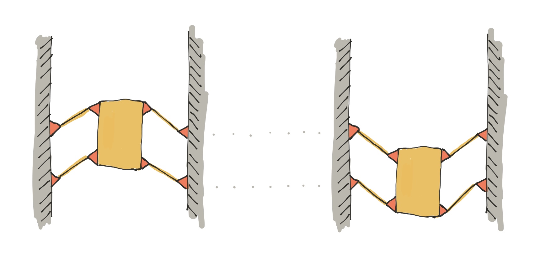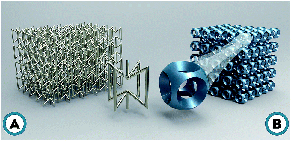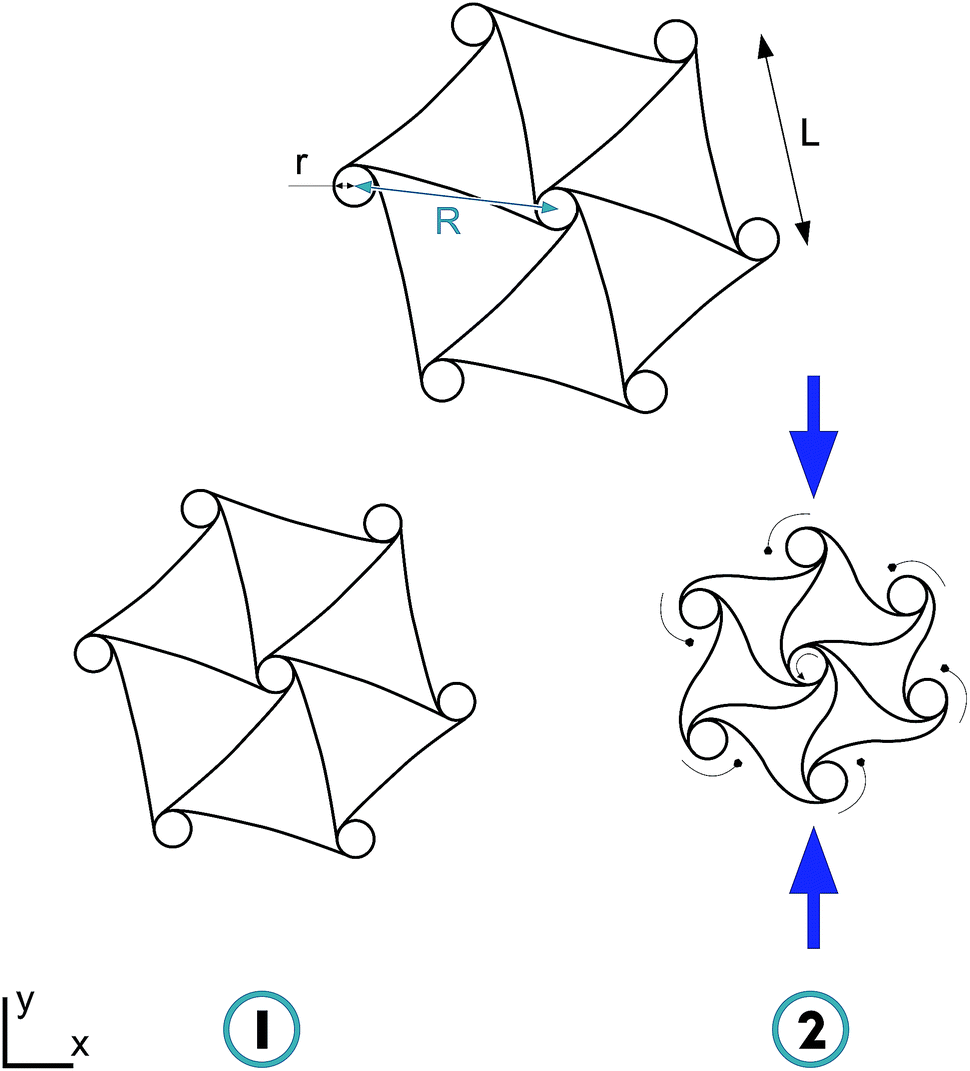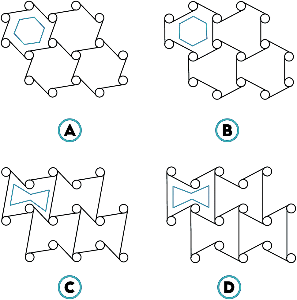 Chiral structures based on hexagonal and re-entrant hexagonal honeycombs. (a) Trichiral honeycomb. (b) Anti-trichiral honeycomb. (c) Re-entrant trichiral honeycomb. (d) Re-entrant anti-trichiral honeycombs.