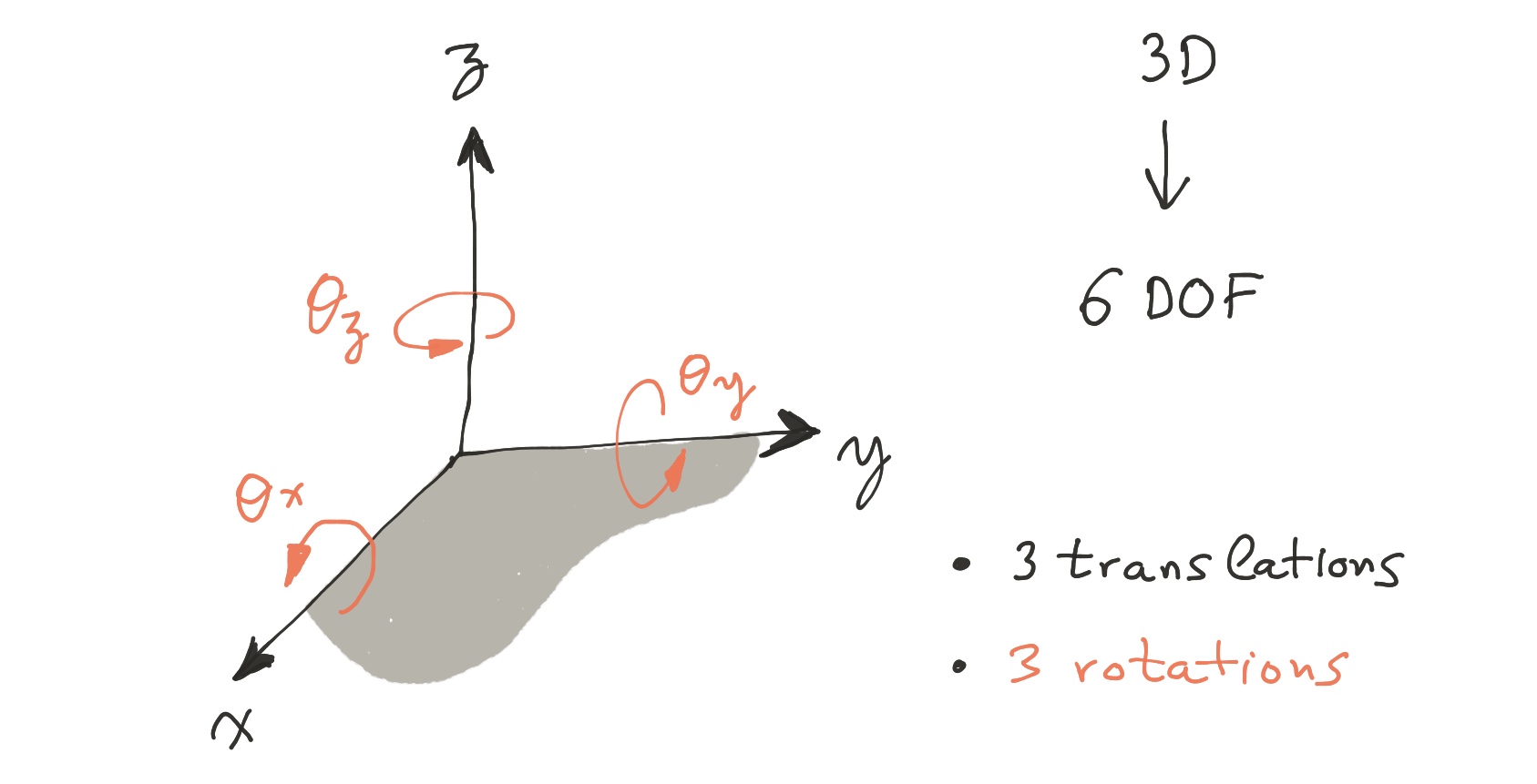 In a 3D space we have 6 DOF: 3 translations and 3 rotations